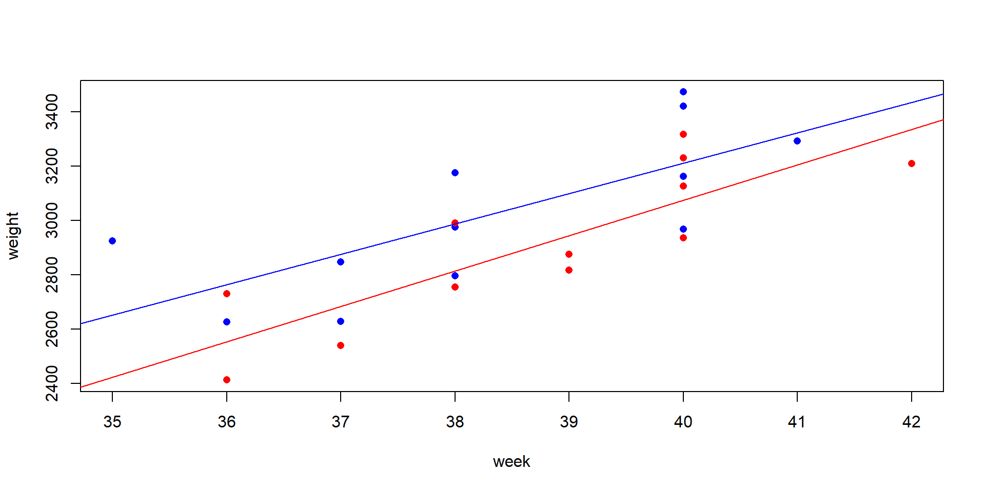 Annette Dobsons Daten zum Geburtsgewicht. Ein Datensatz aus einem Statistik-Lehrbuch (Dobson, 2013), Geburtsgewicht von Jungen und Mädchen in Abhängigkeit von der Schwangerschaftswoche.