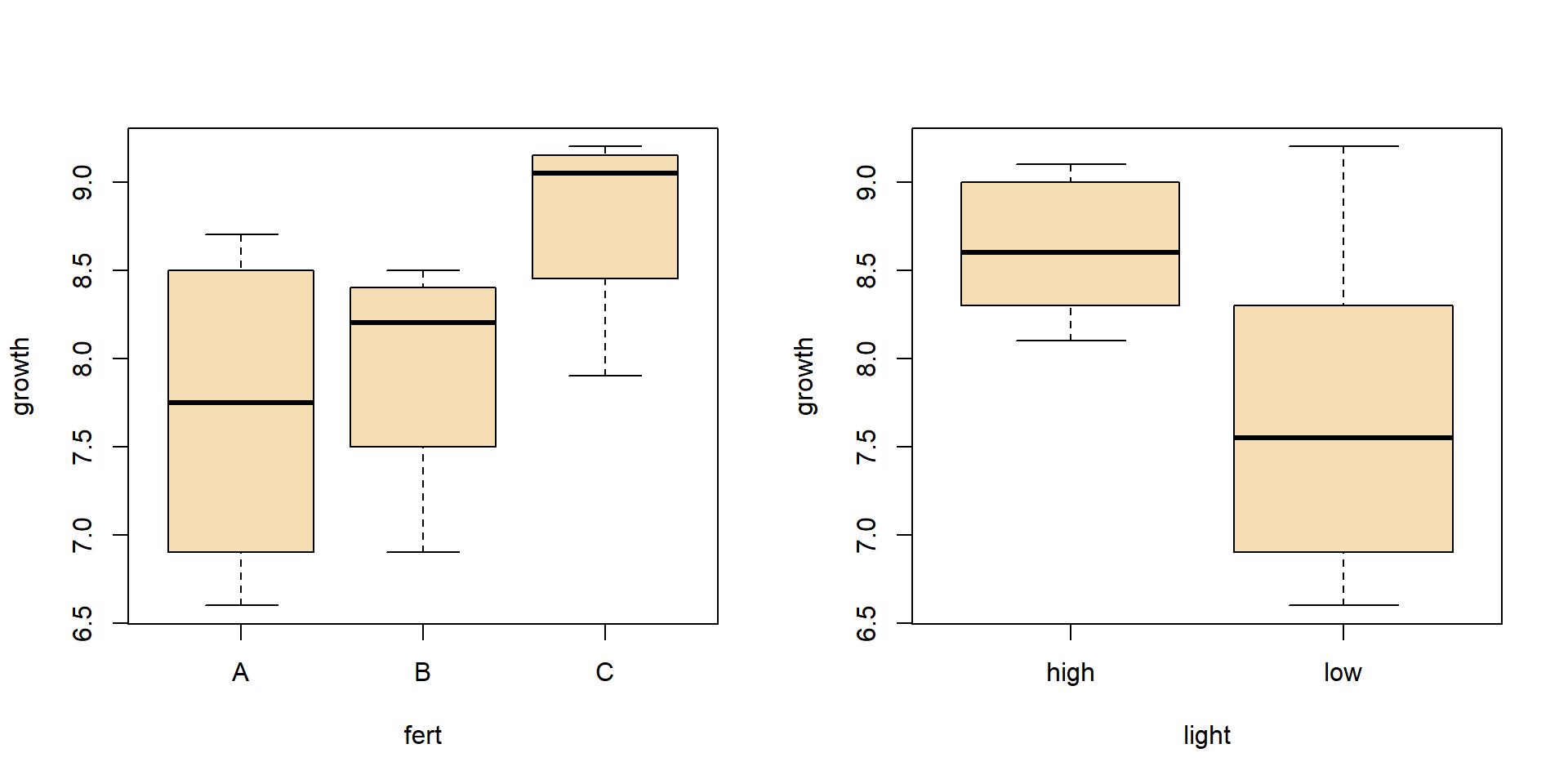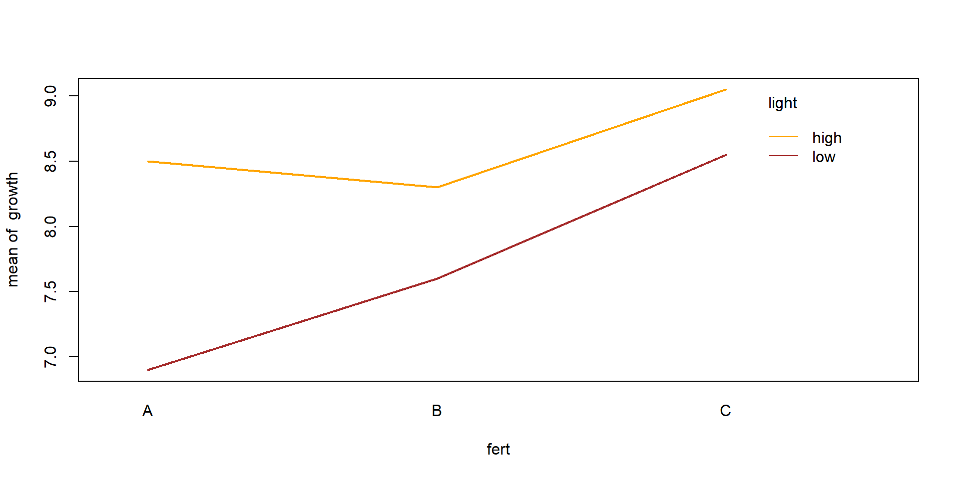 m3 <- lm(growth ~ fert * light, data=plants) # f1 + f2 + f1:f2