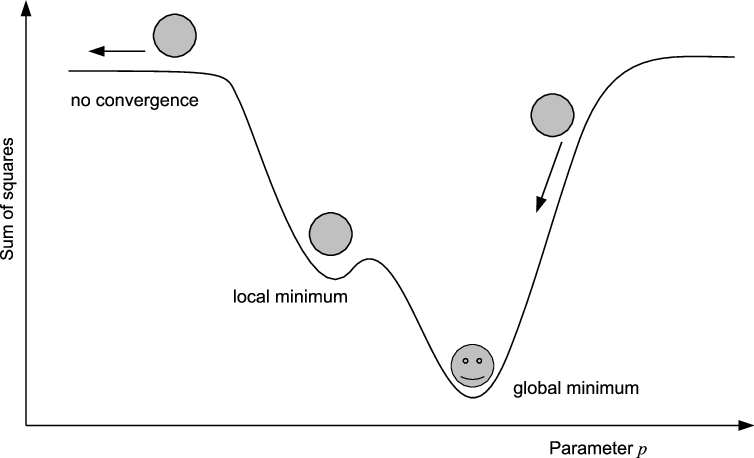[>] Geeignet, wenn die Fehlerstruktur bereits homogen ist und/oder keine analytische Lösung existiert. [+] Kann zur Anpassung beliebiger Funktionen verwendet werden, sofern die Parameter identifizierbar sind. [-] Benötigt Startwerte und beträchtliche Berechnungszeit. [-] Beste Lösung (globales Optimum) ist nicht garantiert.