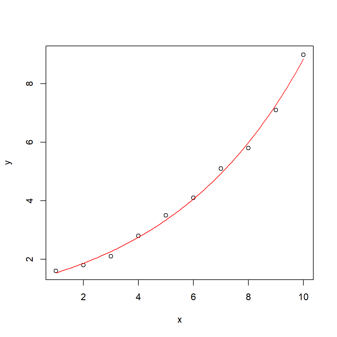# zusätzliche x-Werte, für eine geglättete Kurvex1 <-seq(1, 10, 0.1)y1 <-predict(fit, data.frame(x = x1))plot(x, y)lines(x1, y1, col ="red")