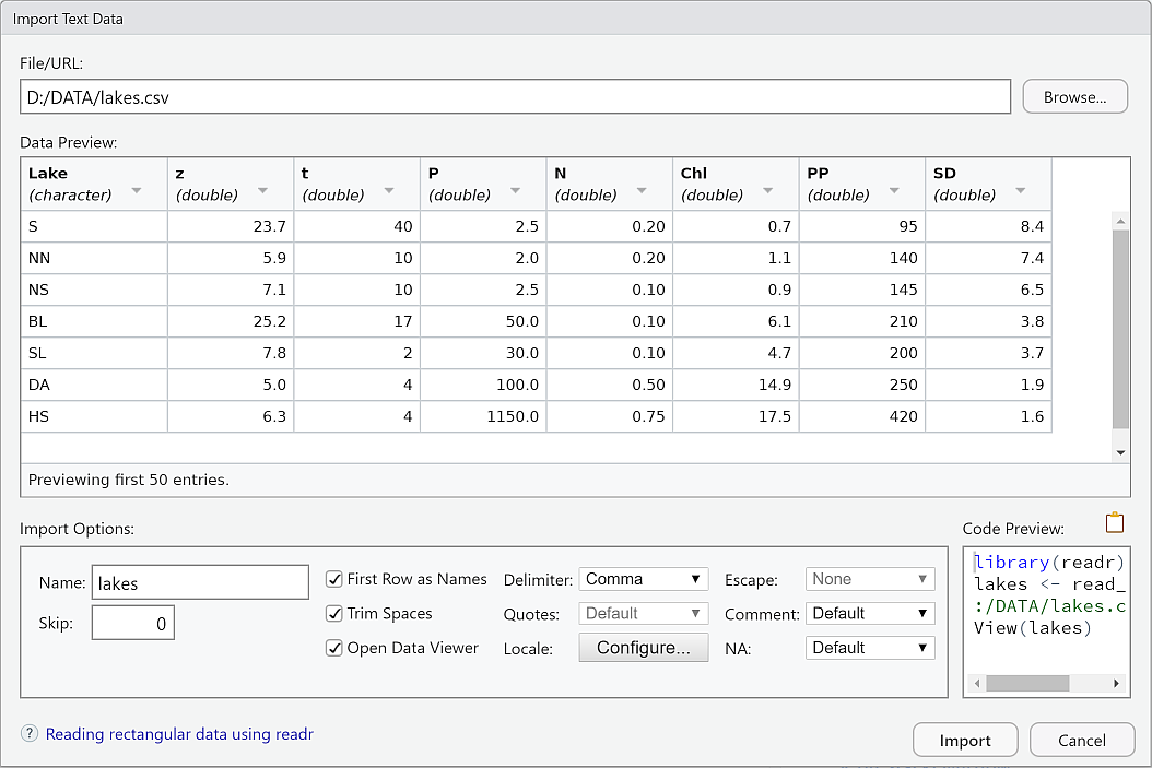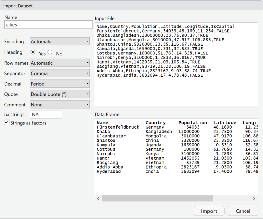 read.table or read.csv Name Country Population Latitude Longitude IsCapital