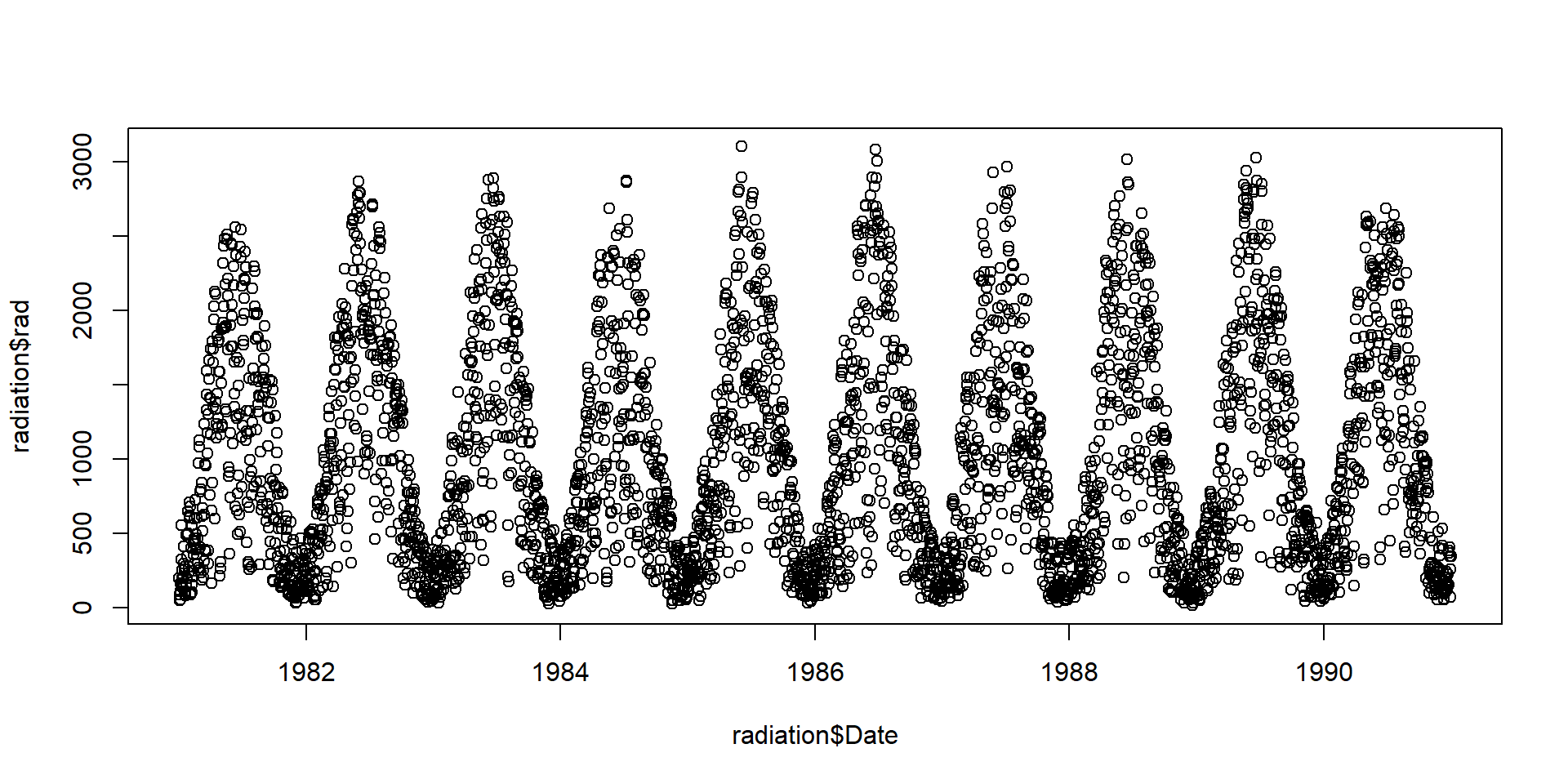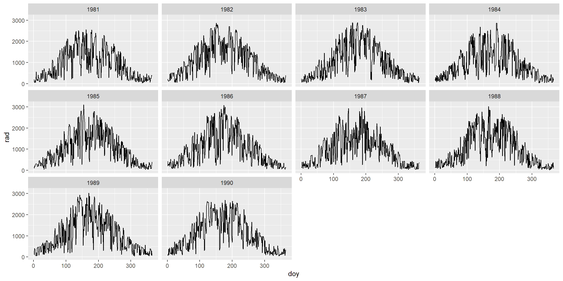 head(radiation) date rad interpolated Date year month doy weekday