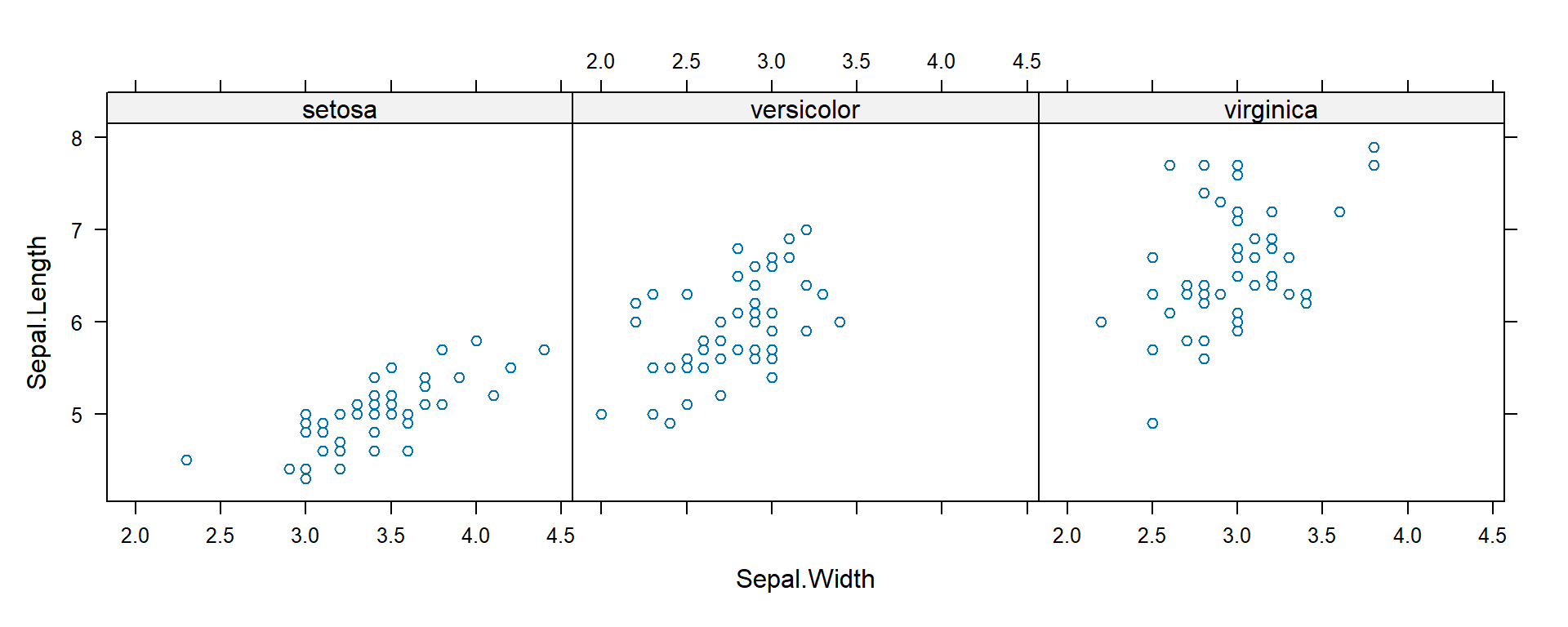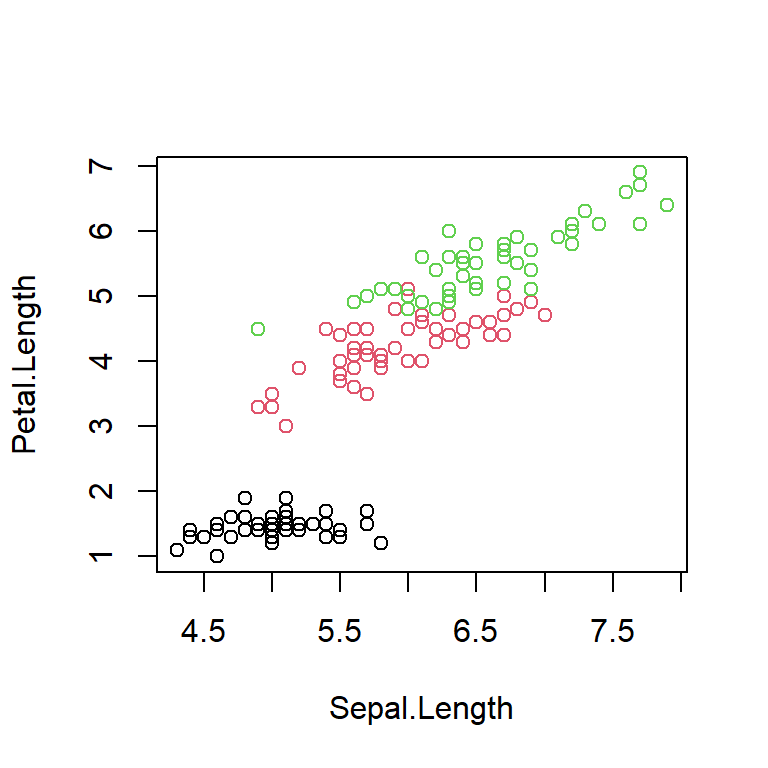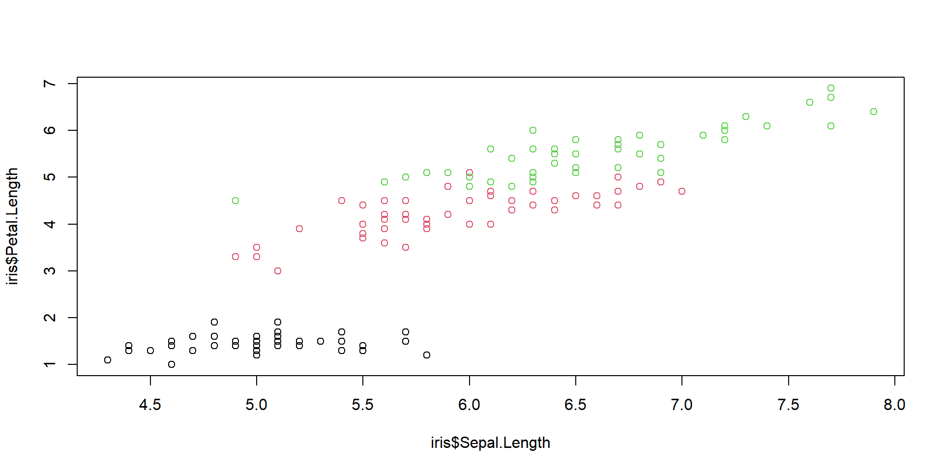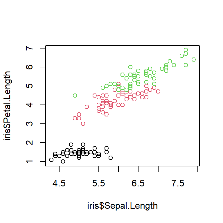 plot(iris$Sepal.Length, iris$Petal.Length, xlim=c(0, 8), ylim=c(2,8),