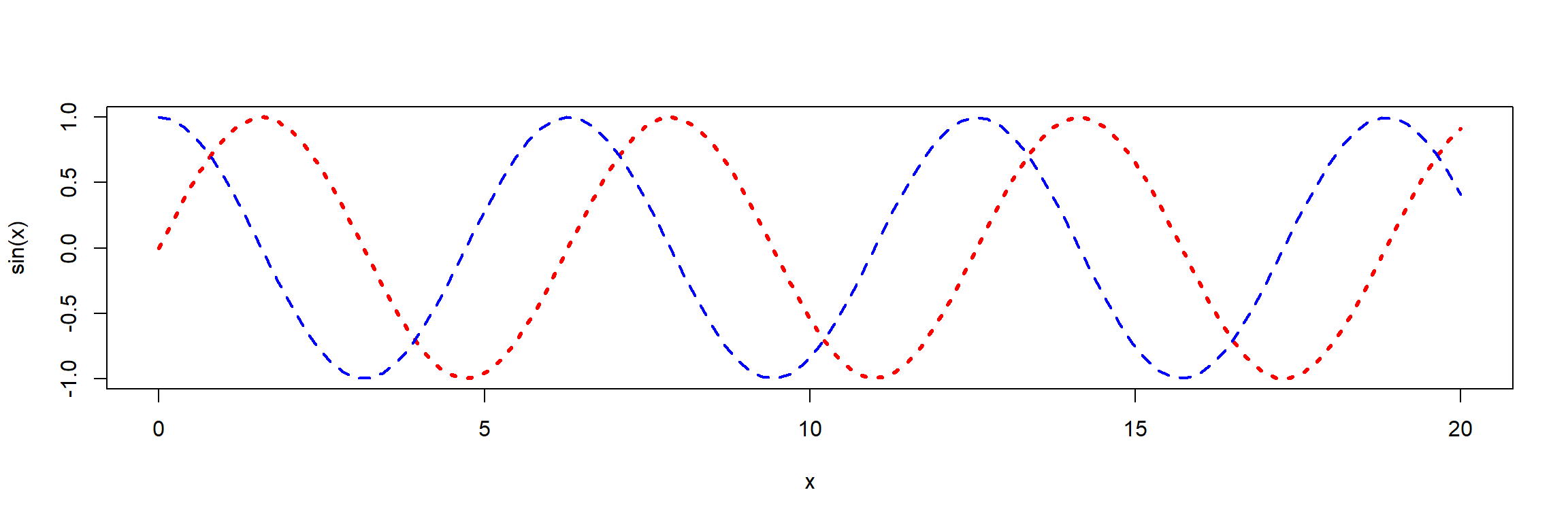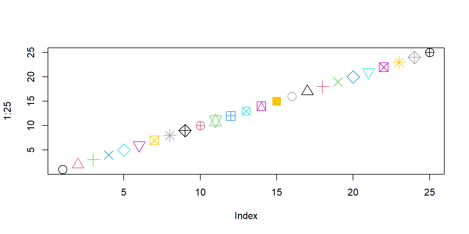 col: color, can be one of 8 default colors or a user-defined colorpch: plotting character, can be one of 25 symbols or a quoted lettercex: character extension: size of a plotting characterlwd: border width of the symbollty: line type (“blank”, “solid”, “dashed”, “dotted”, “dotdash”, “longdash”, “twodash”) or a number from 1…7, or a string with up to 8 numbers for drawing and skipping (e.g. “4224”).lwd: line width (a number, defaults to 1)col=iris$Species: works because Species is a factorlas=1: numbers on y-axis upright (try: 0, 1, 2 or 3)log: may be used to transform axes (e.g. log=“x”, log=“y”, log=“xy”)mycolors <- c("blue", "red", "cyan")