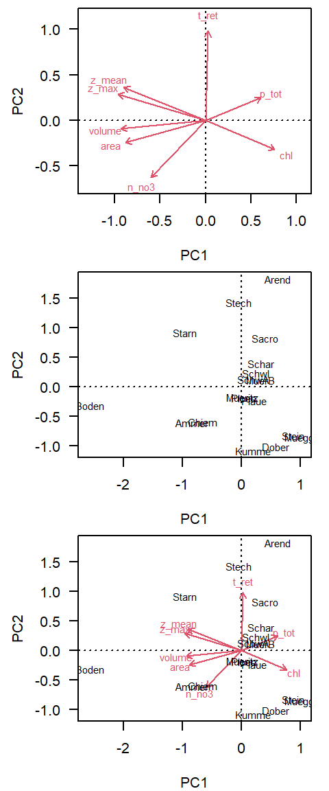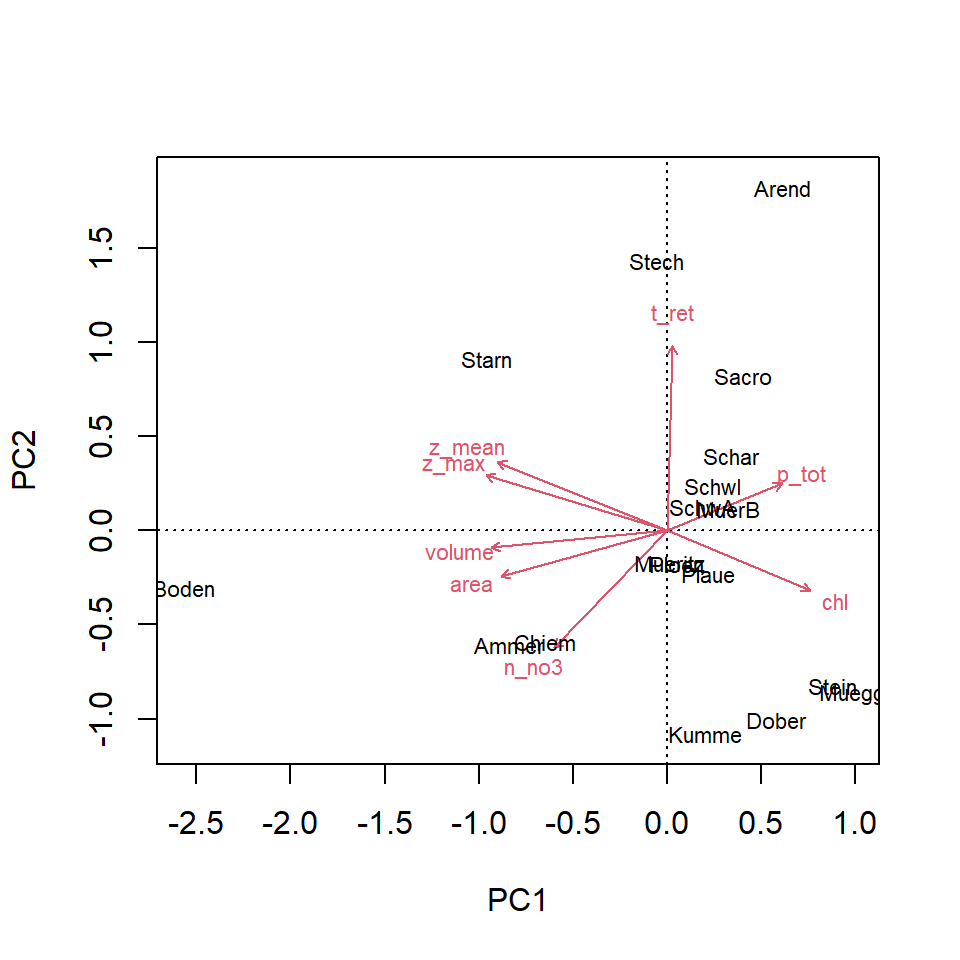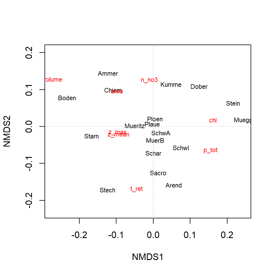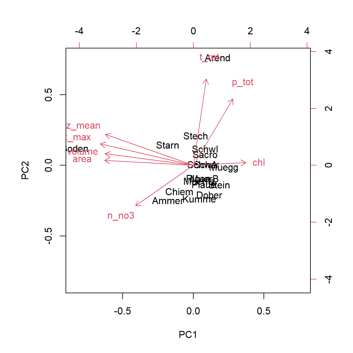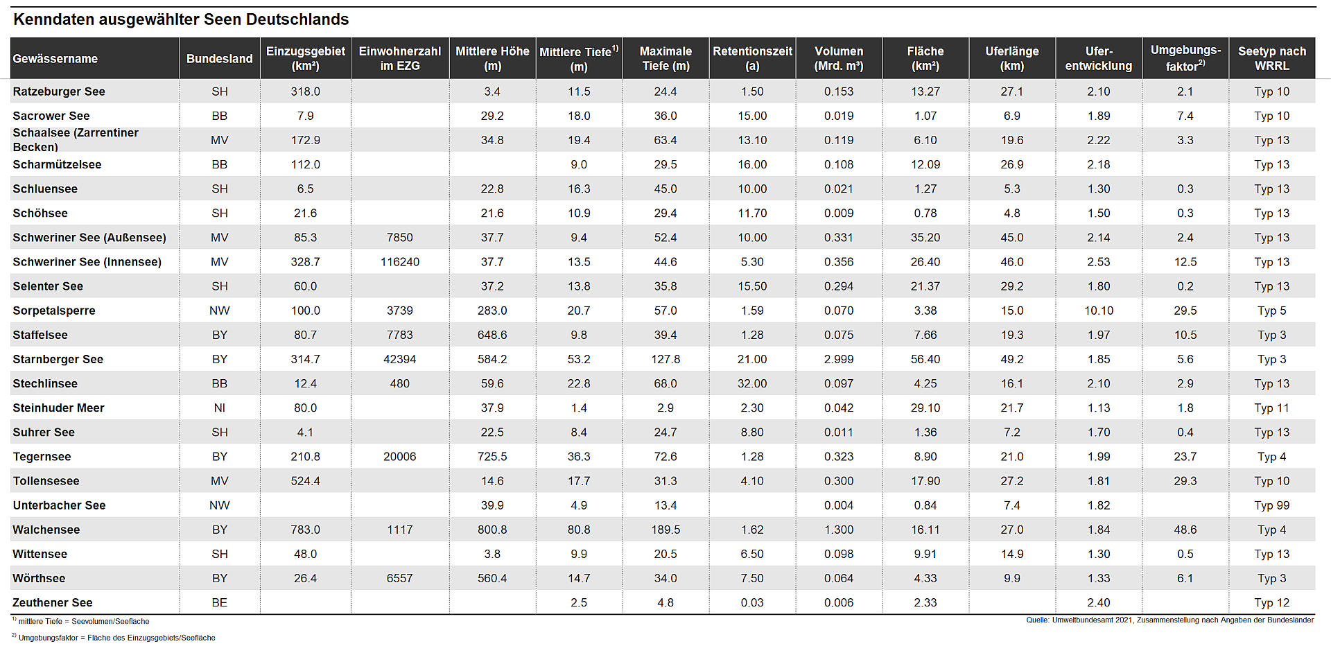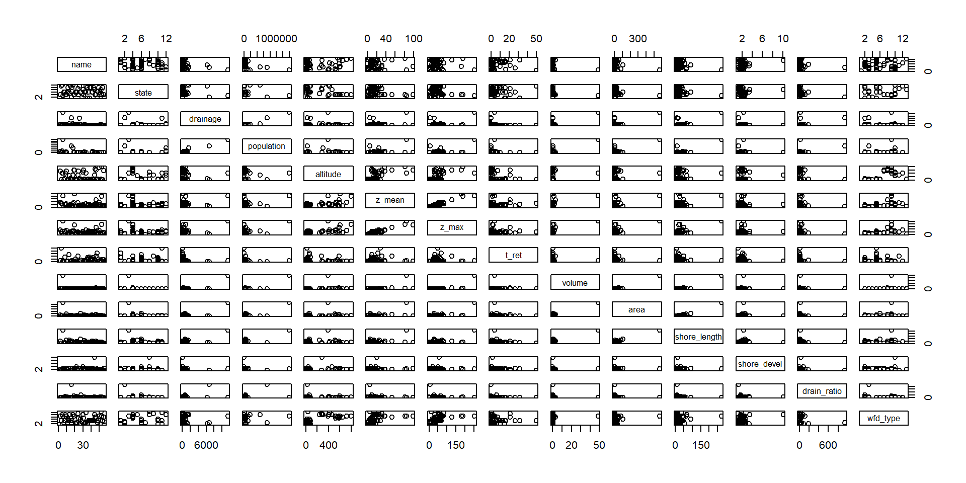 mean and maximum depth (\(\mathrm{m}\)): z_mean, z_max; retention time (years): t_ret; volume (\(\mathrm{10^9 m^3}\)); area (\(\mathrm{km^2}\)), total phosphorus P (\(\mathrm{\mu g/L}\)): p_tot; nitrogen-N (\(\mathrm{mg/L}\)): n_no3, chlorophyll (\(\mathrm{\mu g/L}\)): chl, water framework directive lake type: wfd_type