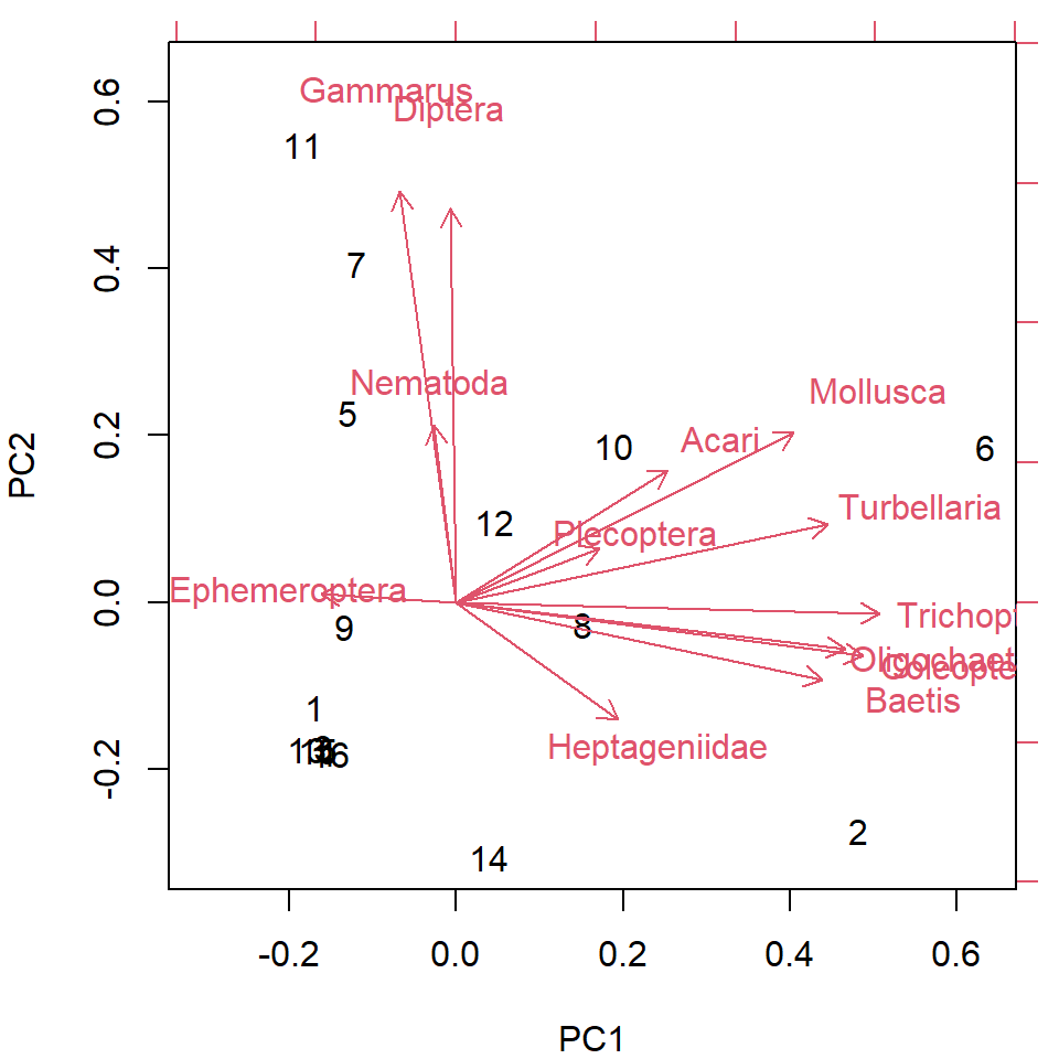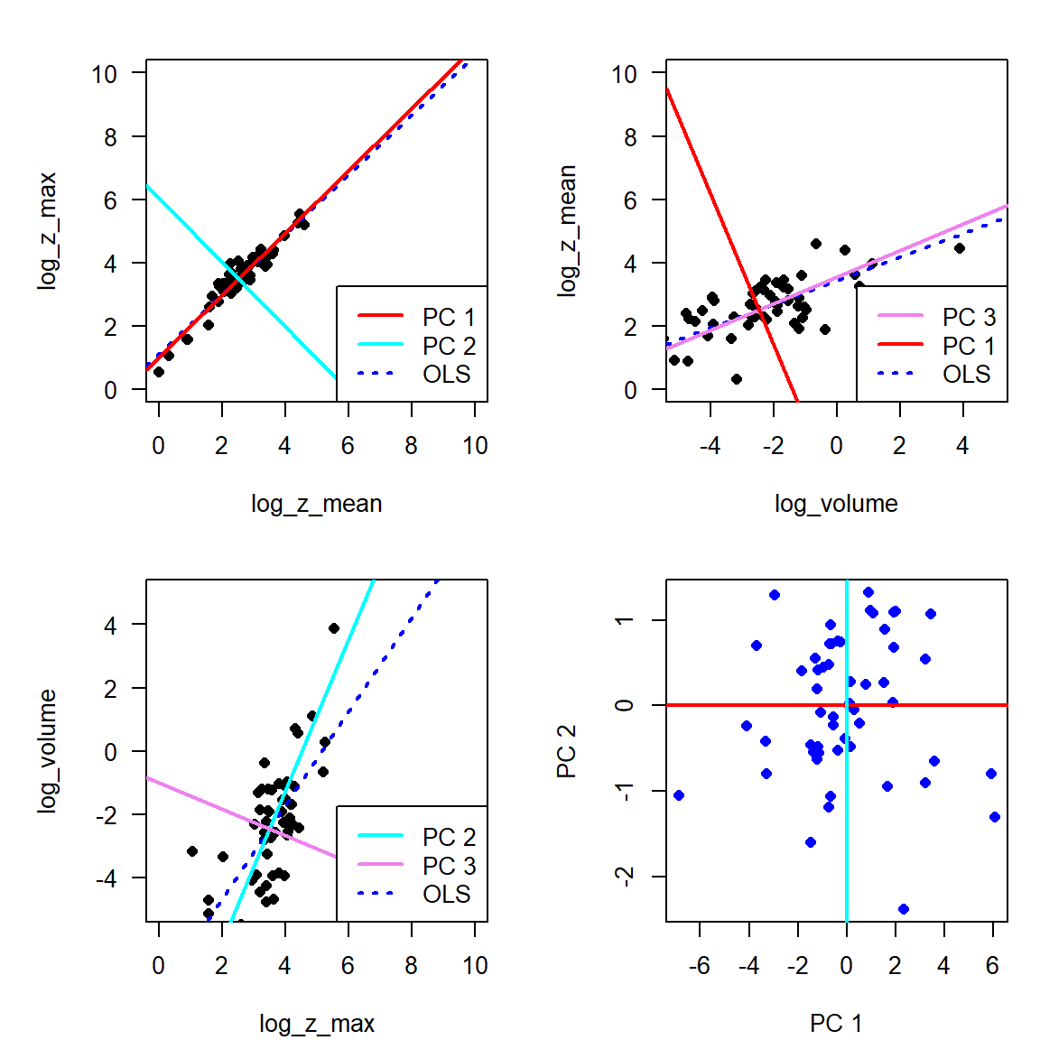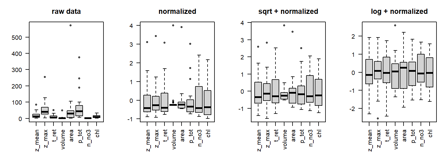 par(mfrow =c(1, 4), mar =c(6, 4, 3, 1), las =2)boxplot(lakedata, main ="raw data")boxplot(scale(lakedata), main ="normalized")boxplot(scale(sqrt(lakedata)), main ="sqrt + normalized")boxplot(scale(log(lakedata)), main ="log + normalized")