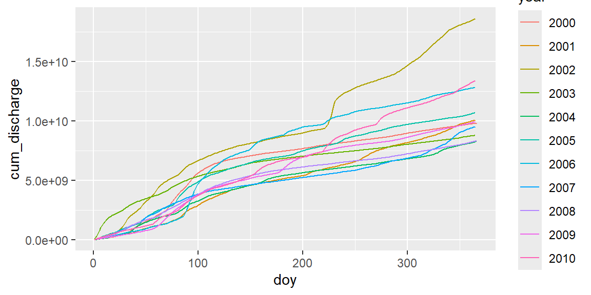 Annual cumulative sum plots are a hydrological standard tool used by reservoir managers. We can use the R function cumsum, that by successive cumulation converts a sequence of: