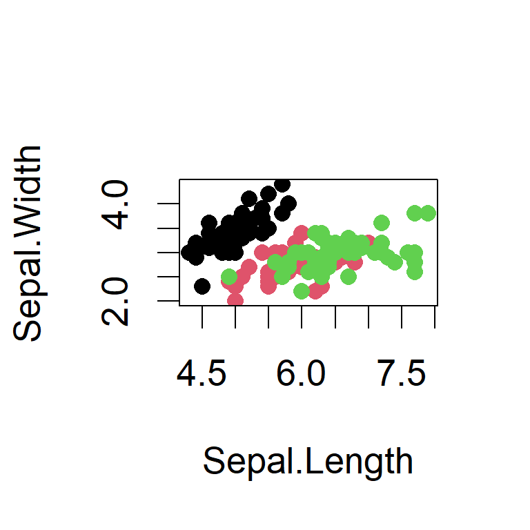 plot(Sepal.Width ~ Sepal.Length, data=iris, pch=16, col=Species)
