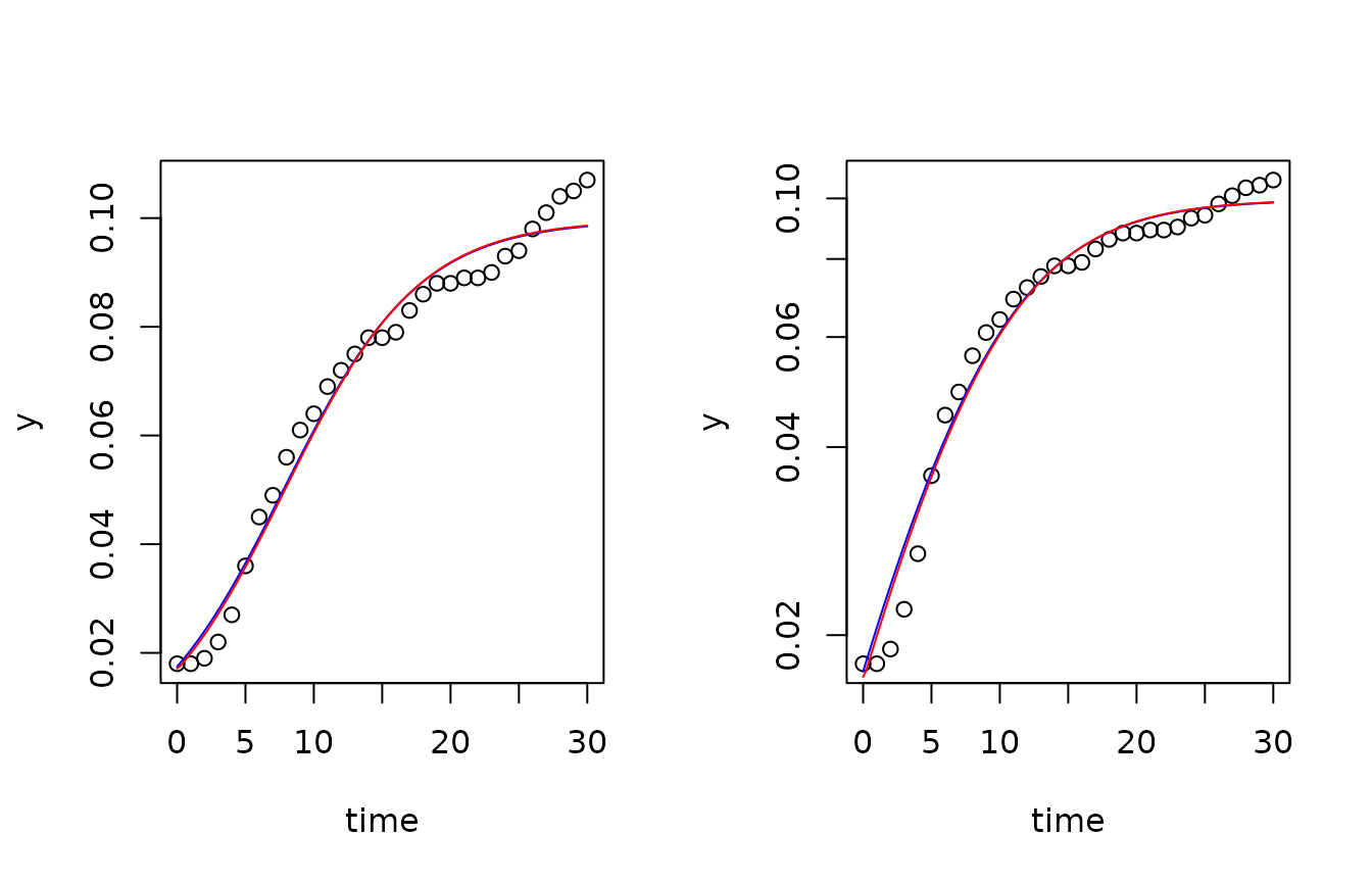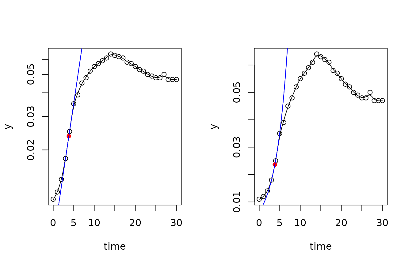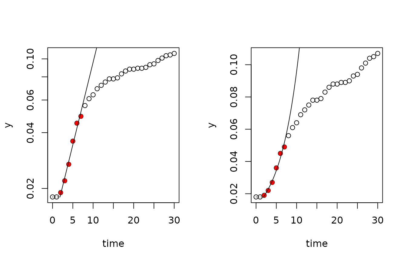 FME(Flexible Modelling Environment) of Soetaert and Petzoldt (2010). In addition to growth models given in closed form (i.e. empirical regression equations or analytical solutions of differential equations) it is also possible to use numerically integrated systems of differential equation. Such models are then solved with package `deSolve’ (Soetaert, Petzoldt, and Setzer 2010). - Fitting of linear models to the period of exponential growth using the ``growth rates made easy method’’ of Hall et al. (2014) ,