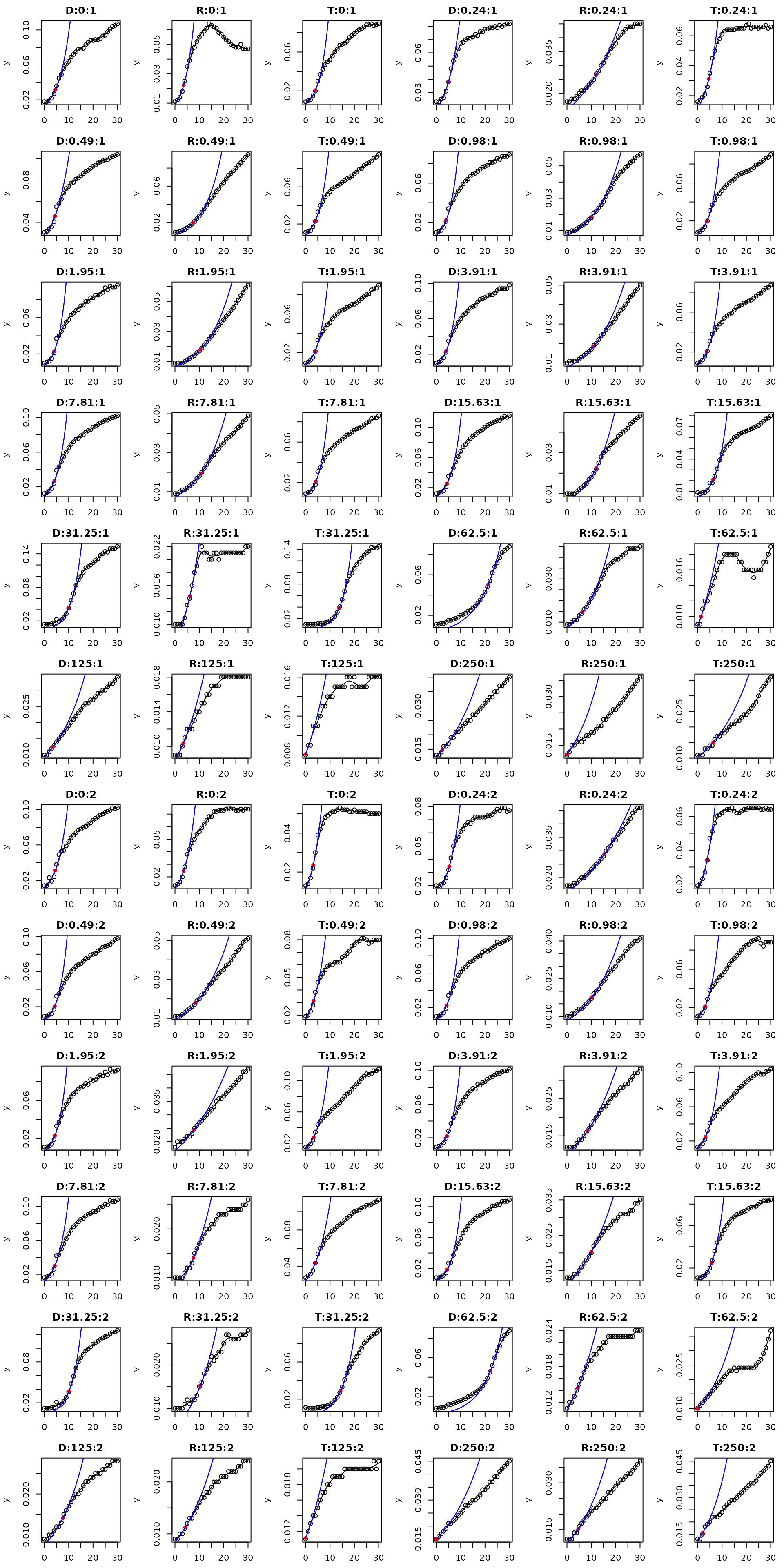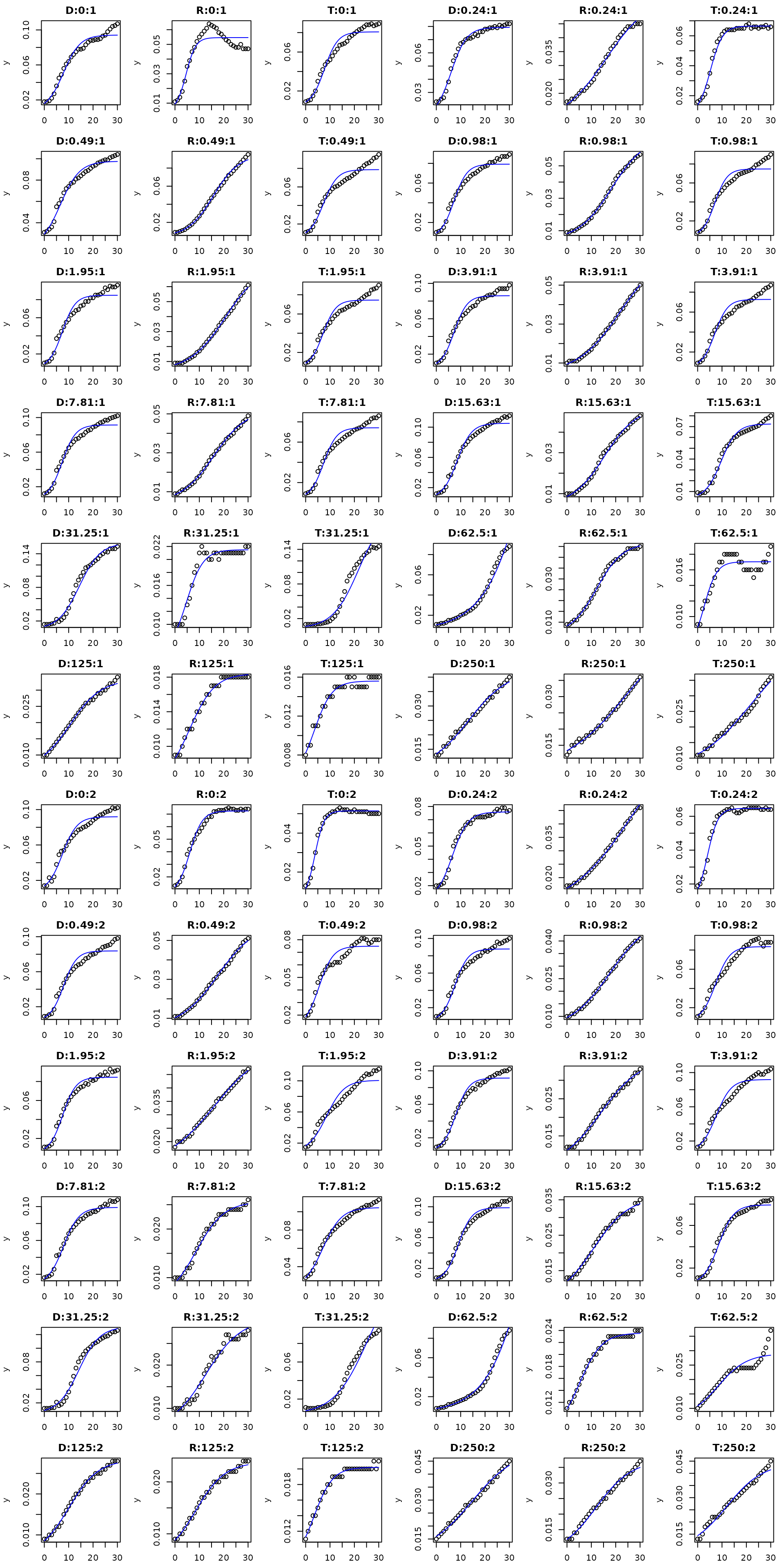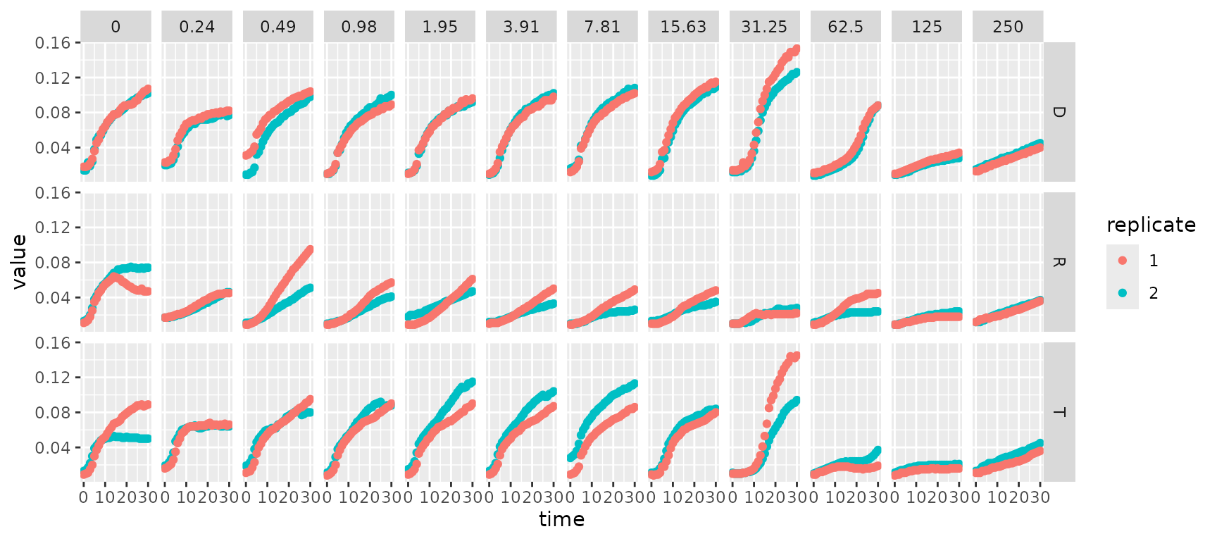 The data set for demonstrating main features of the package was provided by Claudia Seiler from one of a series of plate reader experiments carried out at the Institute of Hydrobiology of TU Dresden. It describes growth of three different strains of bacteria (D = Donor, R = Recipient, T = transconjugant) in dependence of a gradient of the antibiotics tetracycline.