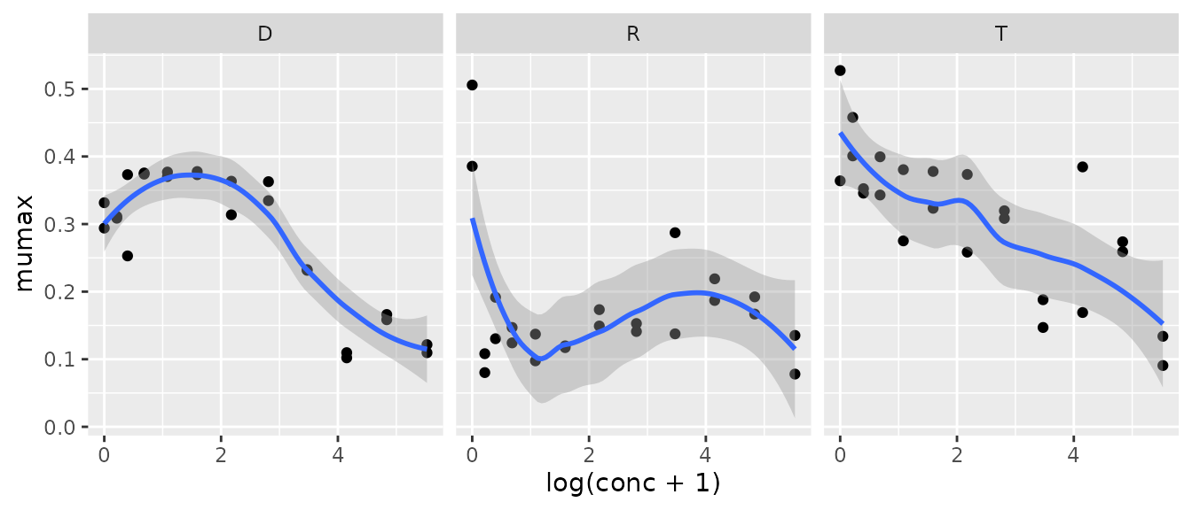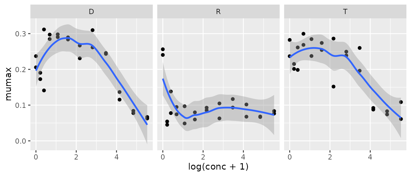 xyplot(mumax ~ log(conc+1)|strain, data = many_baranyi2_res, layout = c(3, 1))Describing the observed dependency can again be approached with nonparametric methods or parametric functional response curves, which may be done using a specialized package for dose-response curves, for example package drc (Ritz and Streibig 2005).