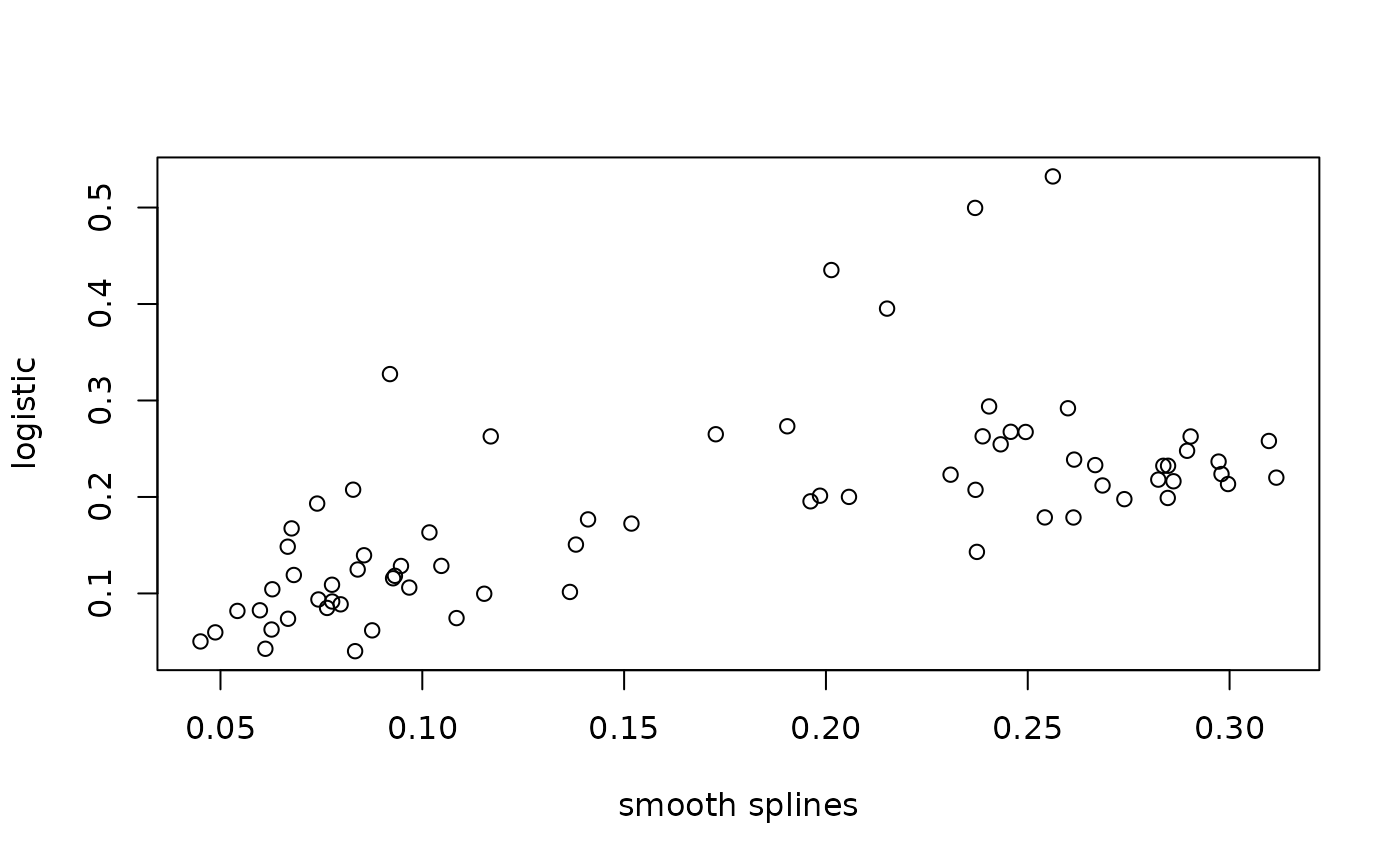 plot(results1$mumax, results2$mumax, xlab="smooth splines", ylab="logistic")