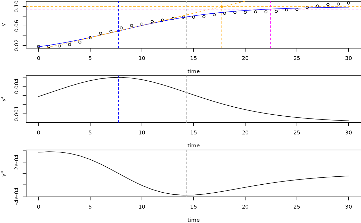 turnpoint: time of turnpoint (50% saturation)sat1: time of the minimum of the 2nd derivativesat2: time of the intercept between the steepest increase (the tangent atmumax) and the carrying capacityKsat3: time when a quantile ofK(default 0.95) is reached
