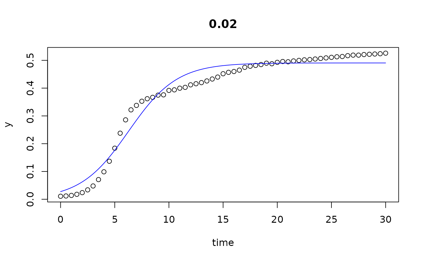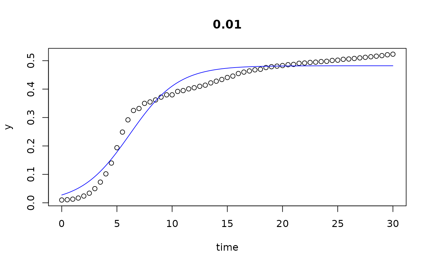 p <- c(y0 = 0.01, mumax = 0.2, K = 0.1) # start parameters