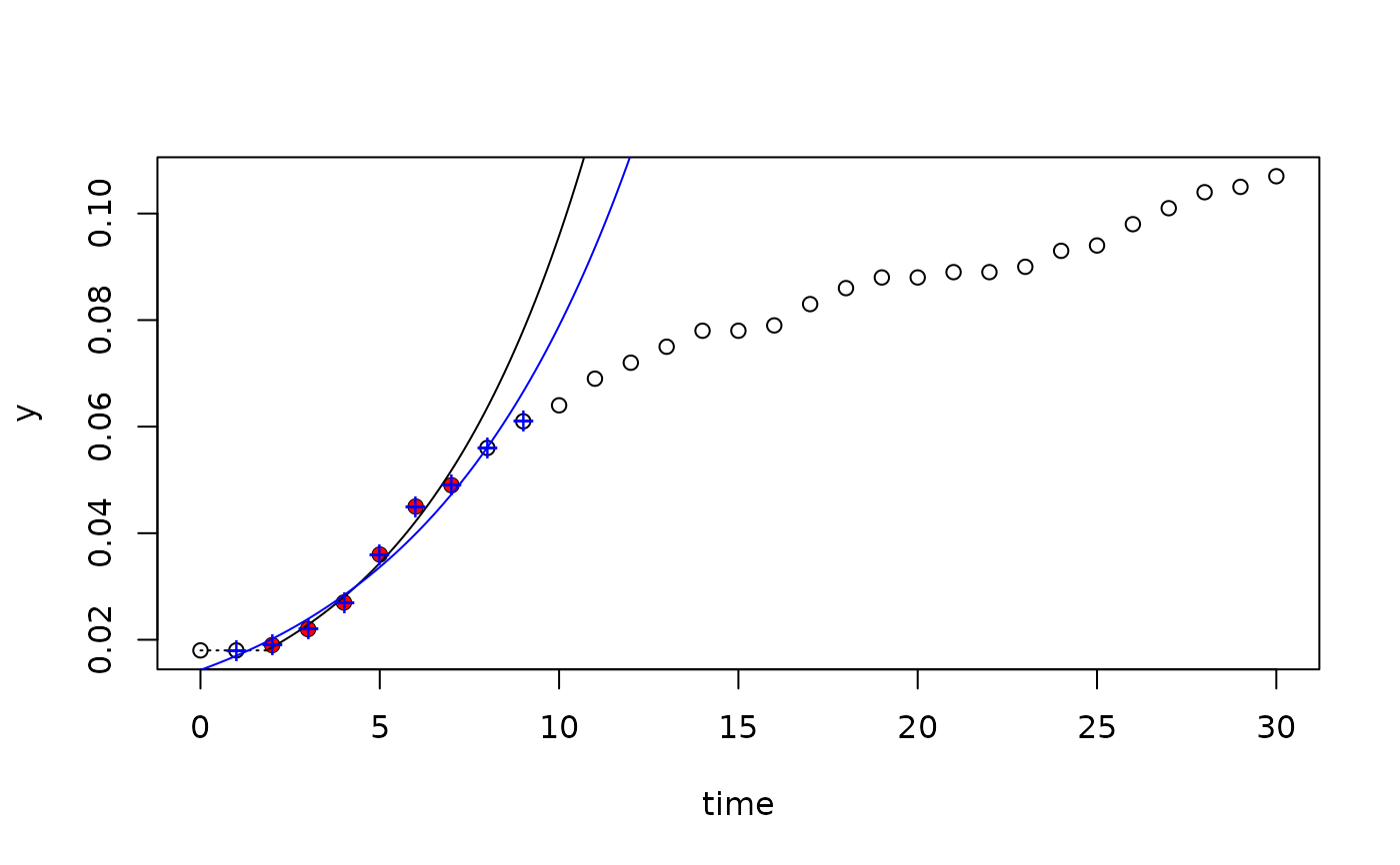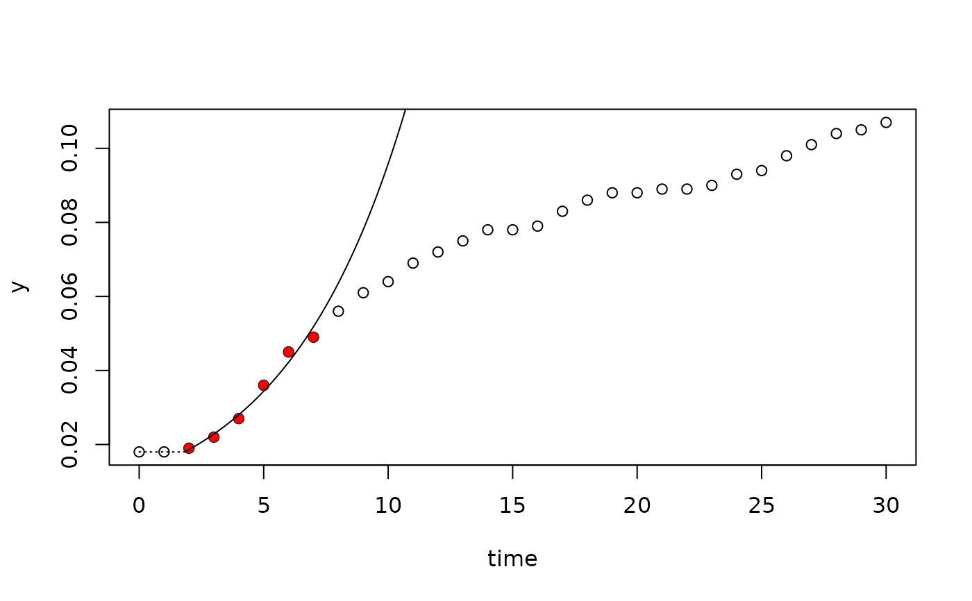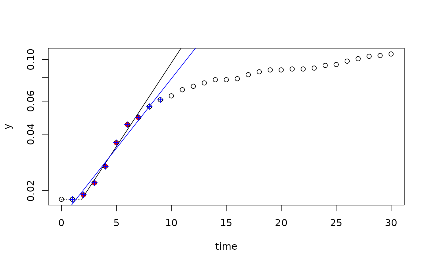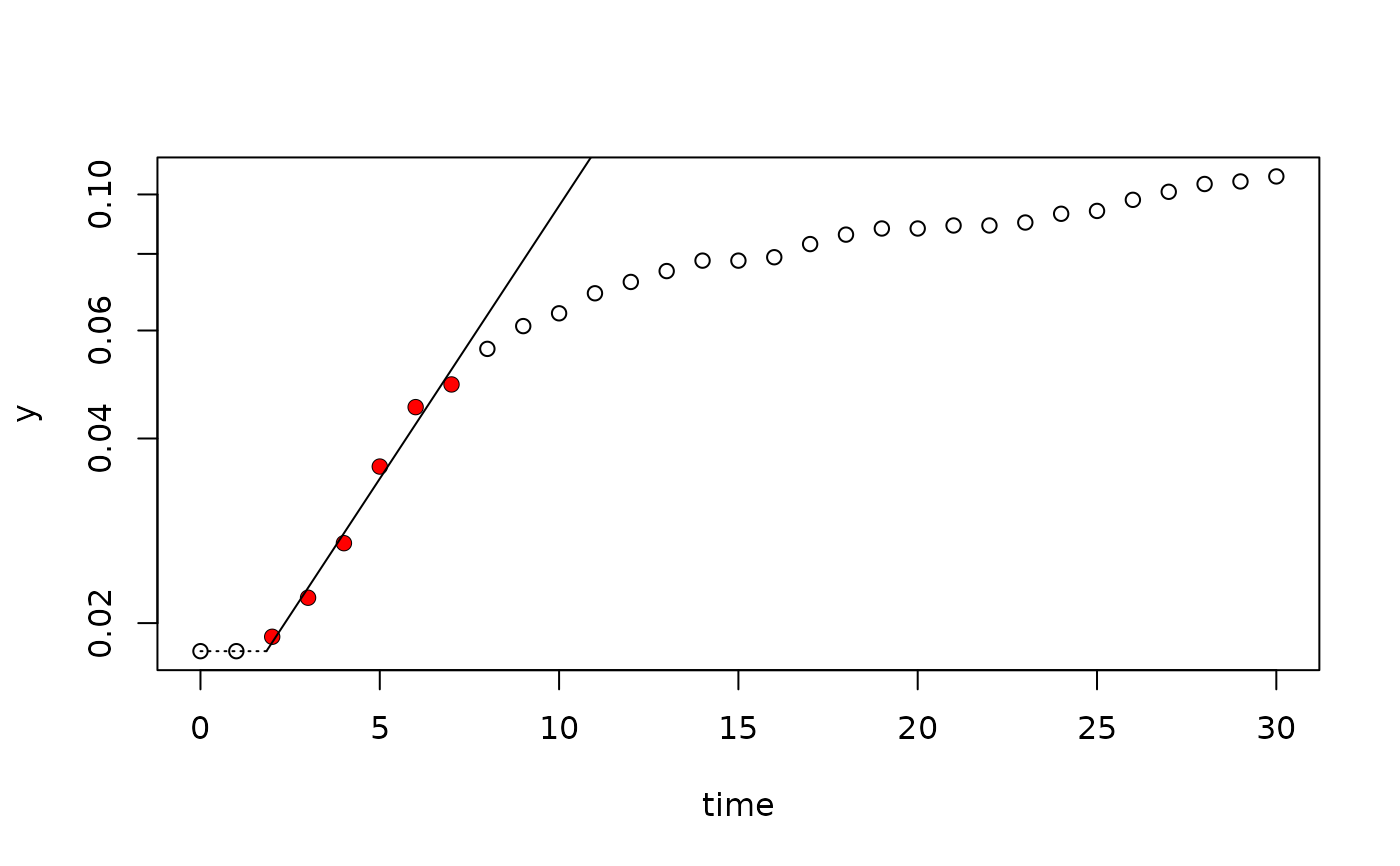 hconsecutive data points. If for example \(h=5\), fit a linear regression to points 1 ... 5, 2 ... 6, 3... 7 and so on. The method seeks the highest rate of exponential growth, so the dependent variable is of course log-transformed.Find the subset with the highest slope \(b_{max}\) and include also the data points of adjacent subsets that have a slope of at least \(quota \cdot b_{max}\), e.g. all data sets that have at least 95% of the maximum slope.