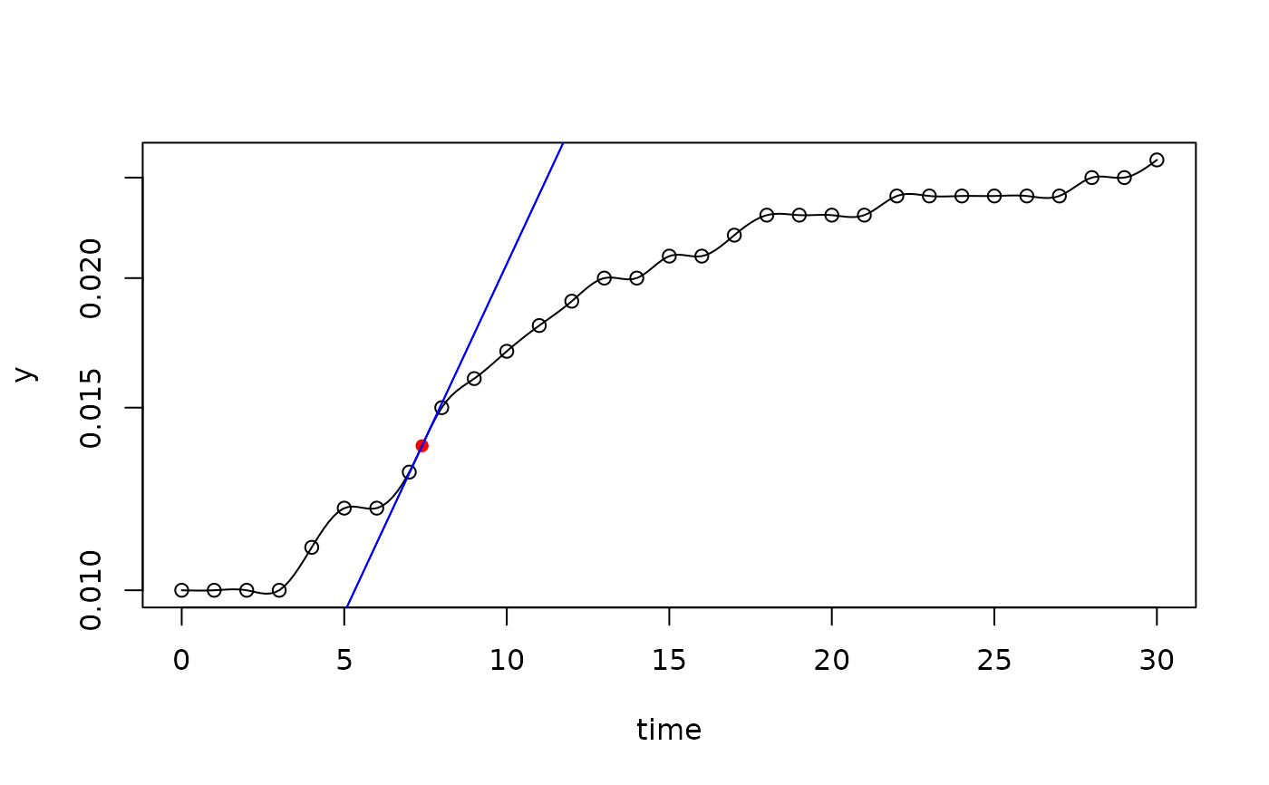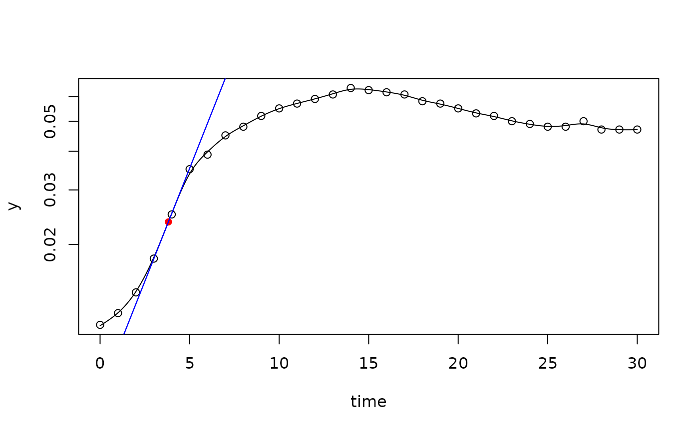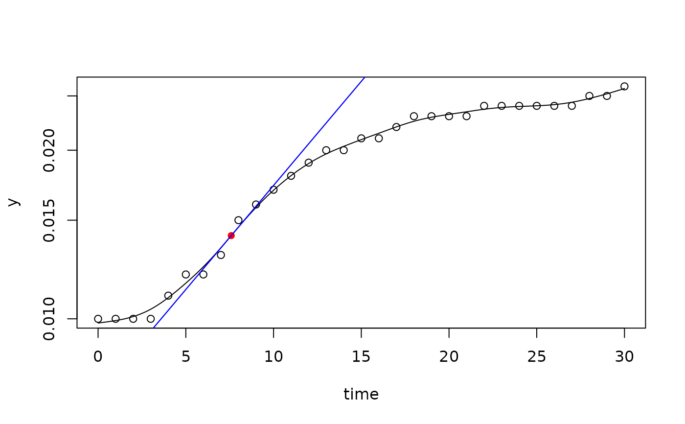 The method was inspired by an algorithm of Kahm et al. (2010), with different settings and assumptions. In the moment, spline fitting is always done with log-transformed data, assuming exponential growth at the time point of the maximum of the first derivative of the spline fit.