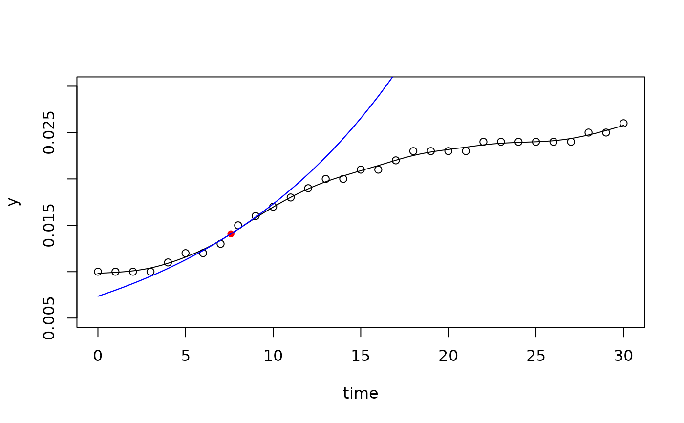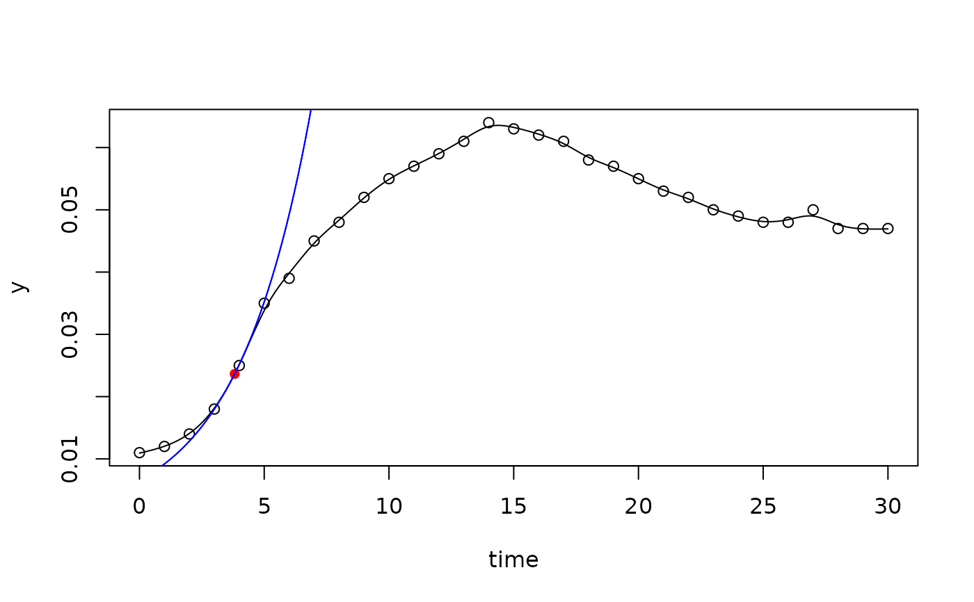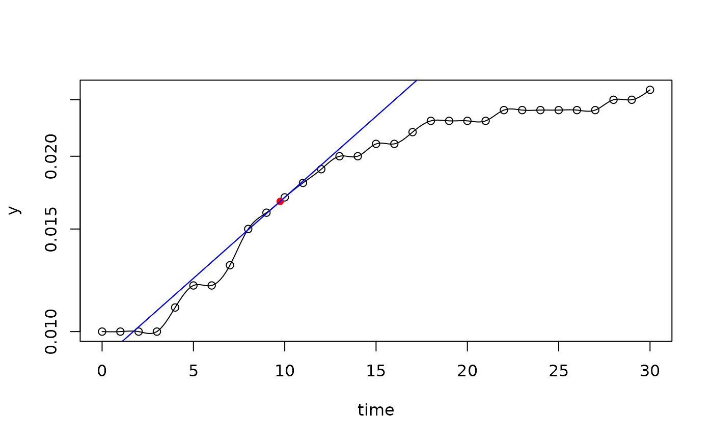 The method was inspired by an algorithm of Kahm et al. (2010), with different settings and assumptions. In the moment, spline fitting is always done with log-transformed data, assuming exponential growth at the time point of the maximum of the first derivative of the spline fit.