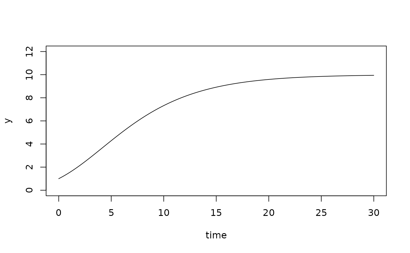 y <- grow_gompertz(time, c(y0=1, mumax=.2, K=10))[,"y"]