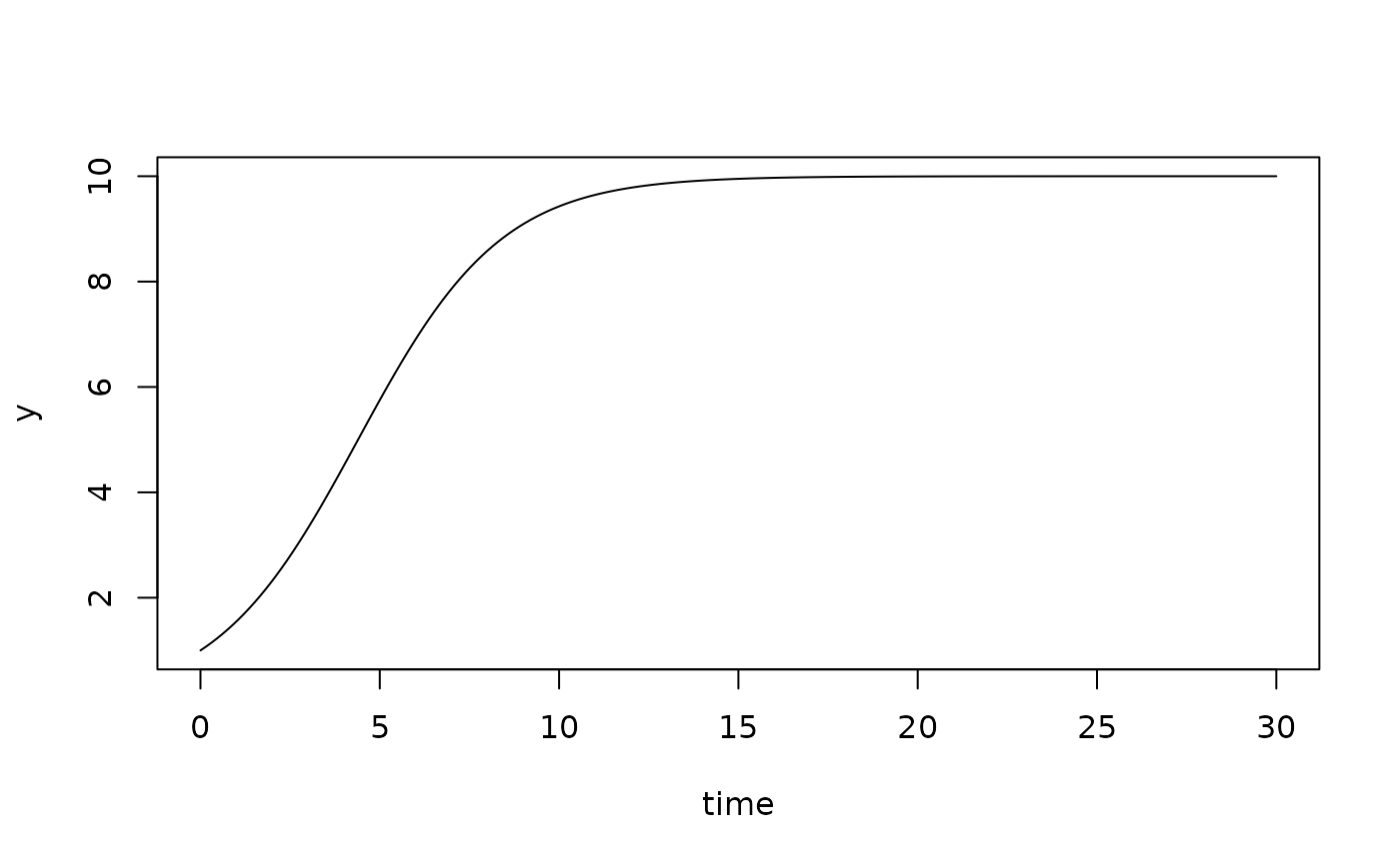 y <- grow_logistic(time, c(y0=1, mumax=0.5, K=10))[,"y"]